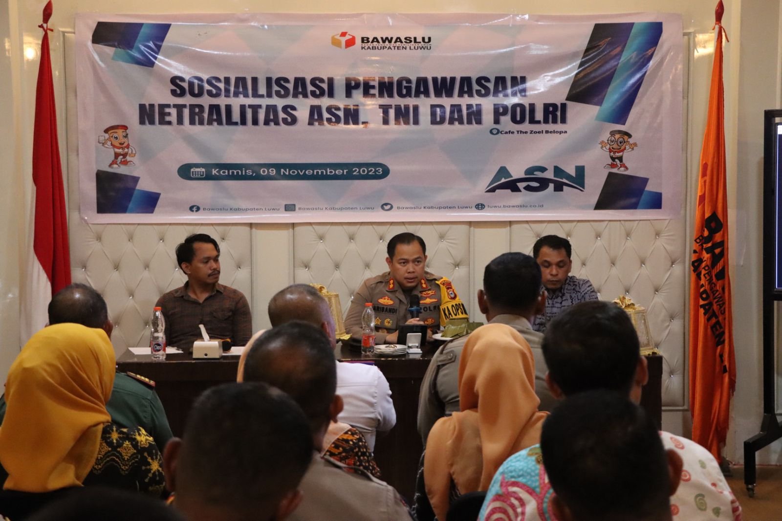 LUWU, TEKAPE.co – Kepala Kepolisian Resor ( Kapolres ) Luwu, AKBP Arisandi, hadir sebagai narasumber pada acara Sosialisasi Pengawasan Netralitas Aparatur Sipil Negara (ASN), TNI dan Polri dalam rangka pelaksanaan Pemilu dan Pilkada Serentak pada 2024, di Aula Cafe The Zoel Belopa Kabupaten Luwu, Senin, 13 November 2023.