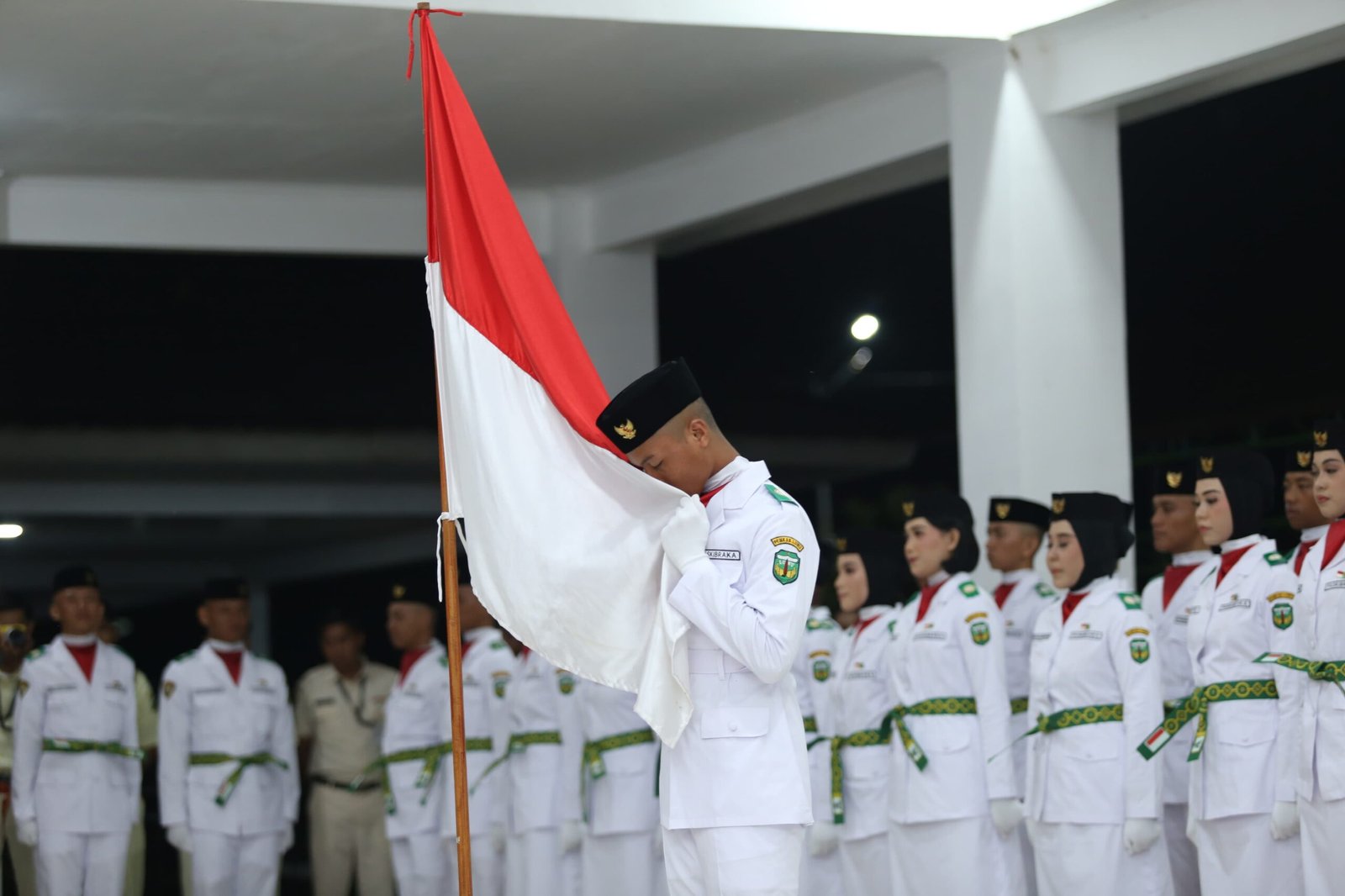 Seorang anggota Paskibraka Kabupaten Luwu mencium Sang Saka Merah Putih sebagai wujud penghormatan pada upacara pengukuhan di Aula Rumah Jabatan Bupati Luwu, Jumat (15/8/2025) malam. (ist)