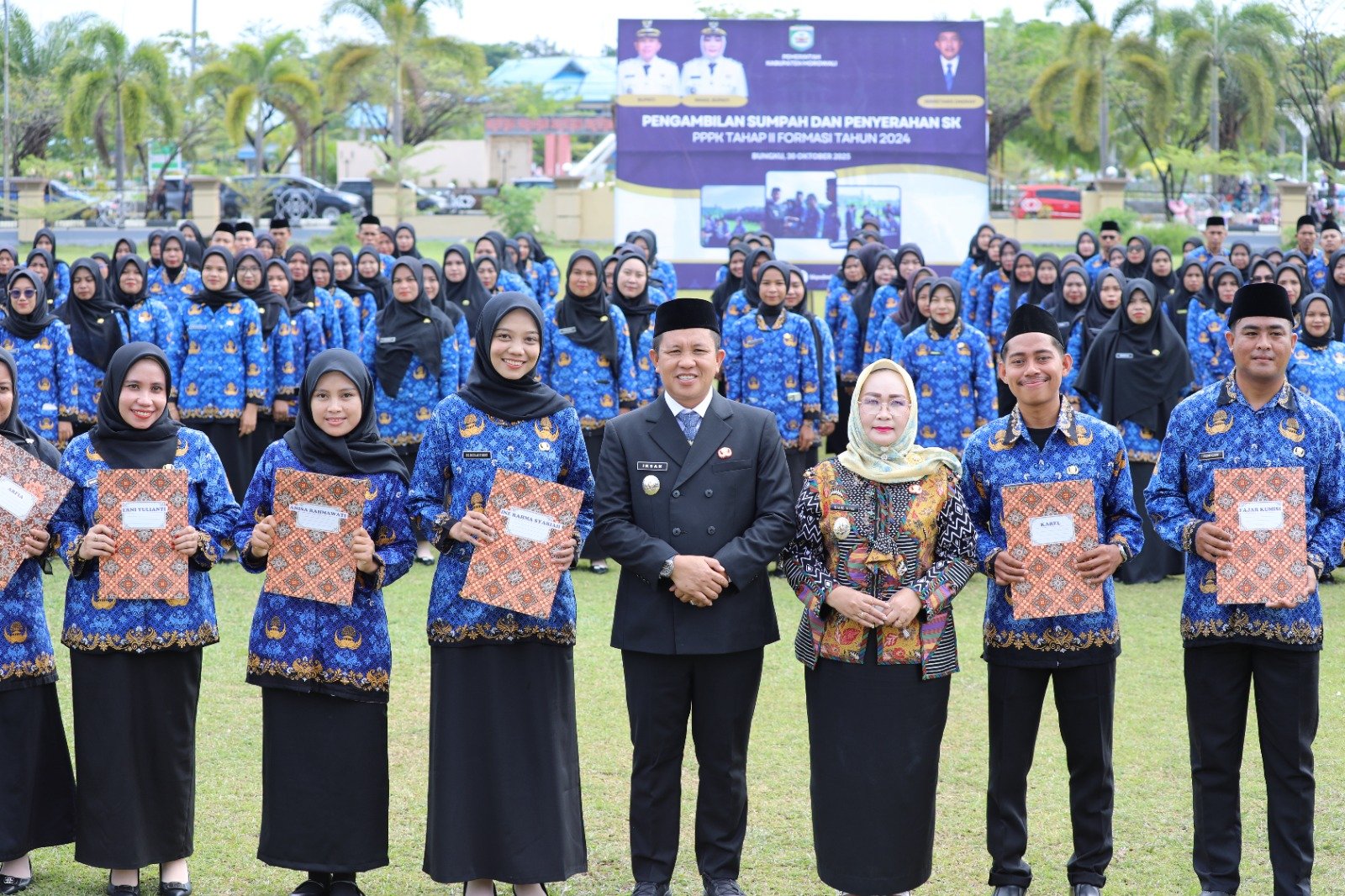 Bupati Morowali, Iksan Baharudin Abdul Rauf, berfoto bersama para Pegawai Pemerintah dengan Perjanjian Kerja (PPPK) Tahap II usai prosesi penyerahan SK dan pengambilan sumpah jabatan di Lapangan Kantor Bupati Morowali, Kamis (30/10/2025).