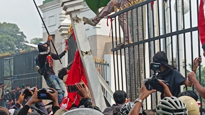Setelah pagar dijebol, sejumlah demonstran pun merangsek ke bagian dalam pagar area Kompleks Parlemen.