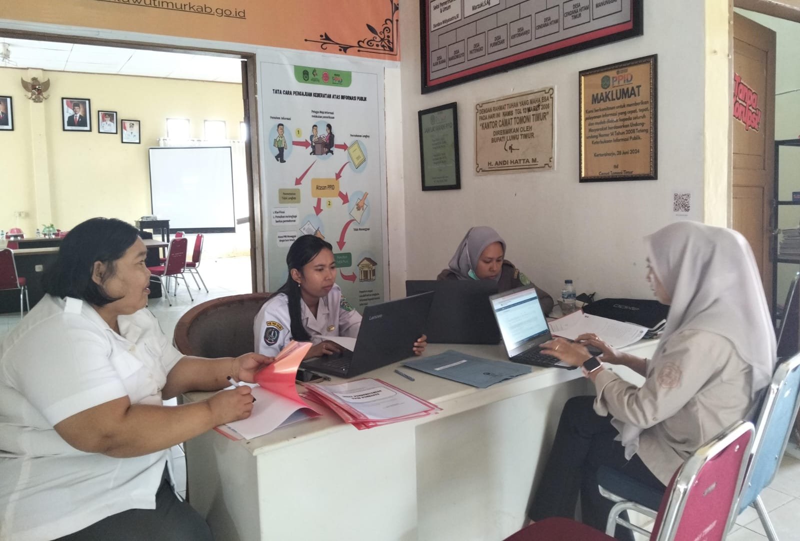 Di Kecamatan Tomoni, kegiatan monev digelar secara gabungan dengan Kelurahan Tomoni. Bertempat di Kantor Camat Tomoni, kegiatan ini diikuti oleh Lurah Tomoni, Kepala Seksi Pelayanan Kecamatan, admin PPID, serta sejumlah staf. Mereka membahas mekanisme pelayanan informasi dan perlunya dokumentasi yang lebih tertata.
