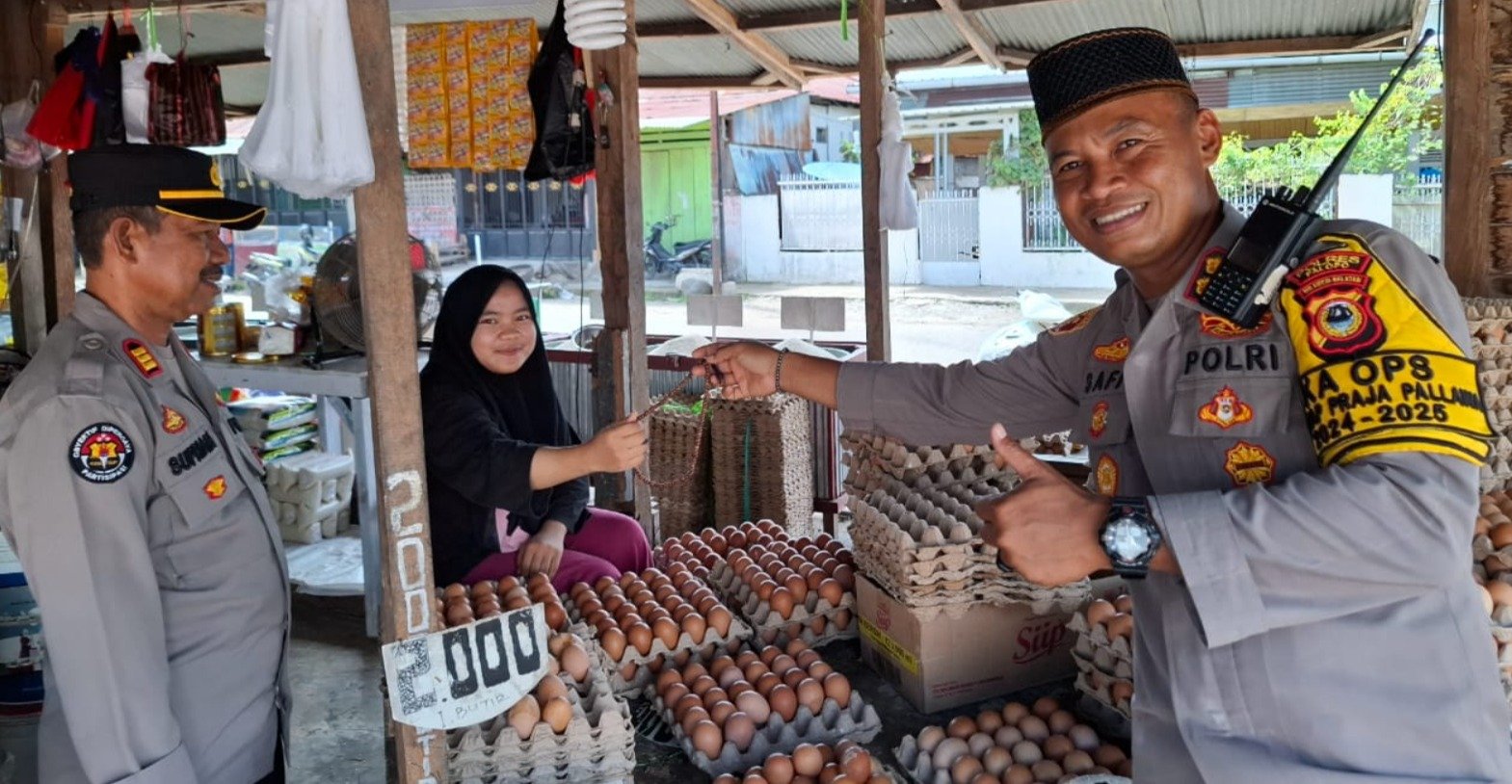 Selain memeriksa harga sembako, rombongan kepolisian juga menggelar aksi sosial berupa pembagian sedekah berupa tasbih kepada pedagang kaki lima dan pengunjung pasar.