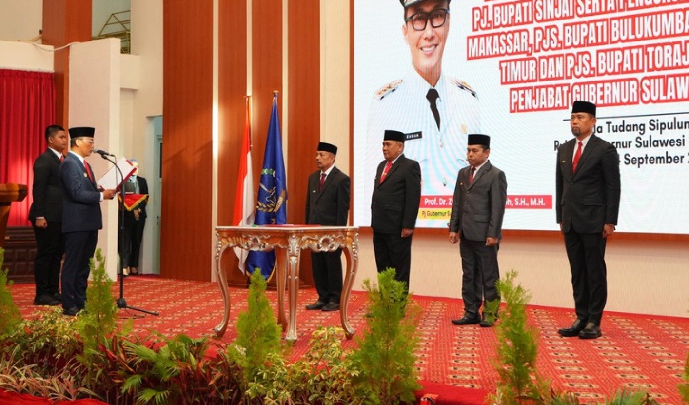 MAKASSAR, TEKAPE.co – Pj Gubernur Sulsel Prof Zudan Arif Fakrulloh melantik empat Pejabat Sementara (Pjs) kepala daerah di Sulsel. Pelantikan dilaksanakan di Aula Tudang Sipulung Rumah Jabatan Gubernur Sulsel, Selasa 24 September 2024.