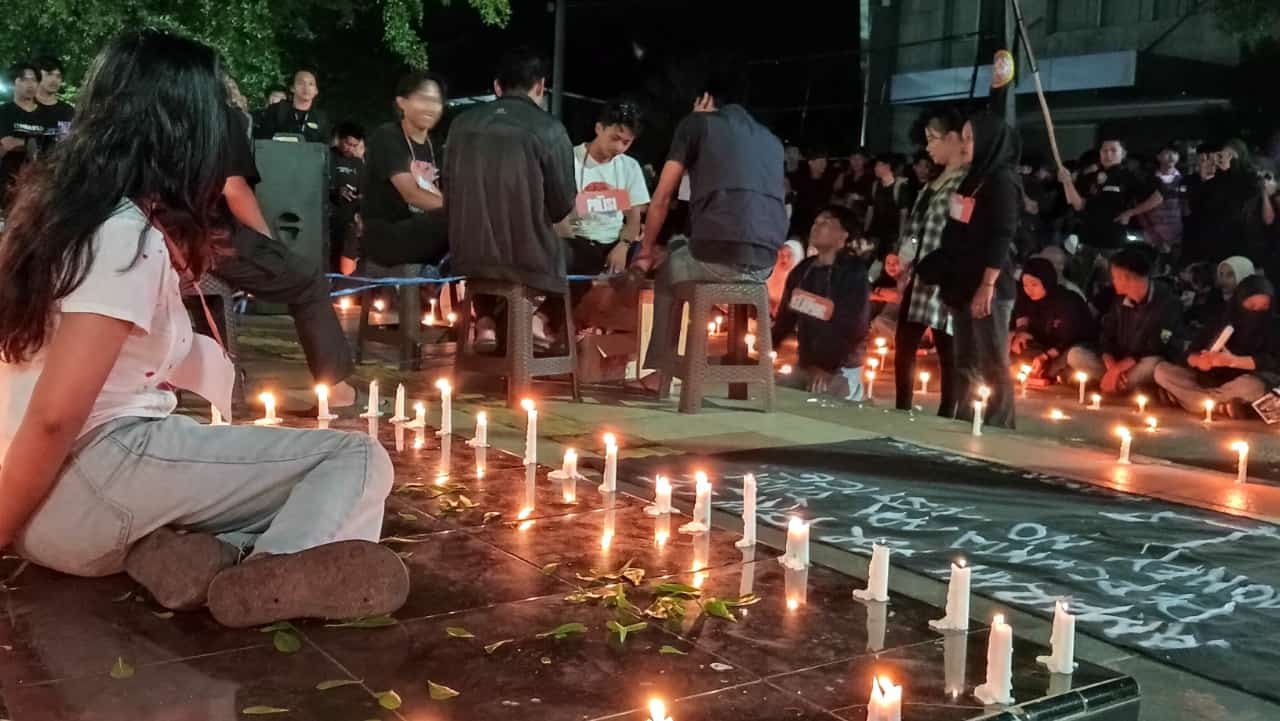 Pantauan TEKAPE.co di lokasi, para mahasiswa mengenakan pakaian serba hitam dan menyalakan puluhan lilin sebagai simbol duka serta tuntutan keadilan.