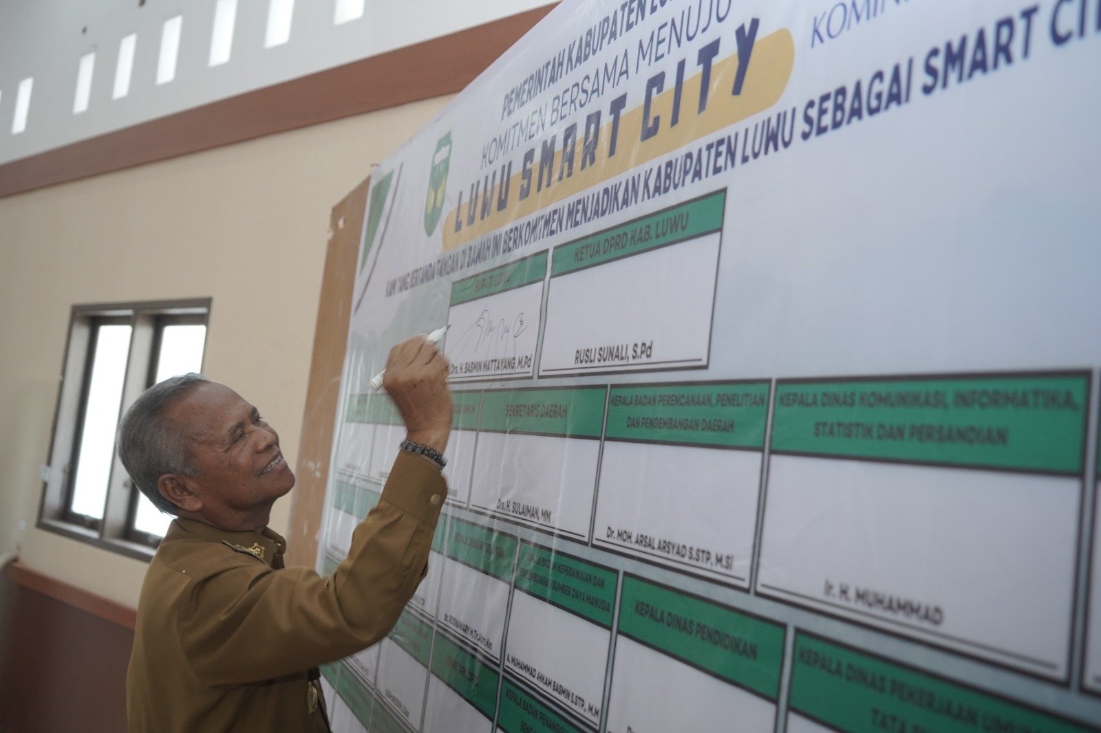 LUWU, TEKAPE.co – Bupati Luwu, Dr. Drs. H. Basmin Mattayang, MPd bersama Ketua Dprd Luwu, Rusli Sunali dan seluruh kepala organisasi perangkat daerah melakukan Penandatanganan Komitmen Bersama Menuju Luwu Kabupaten Cerdas (Smart City).