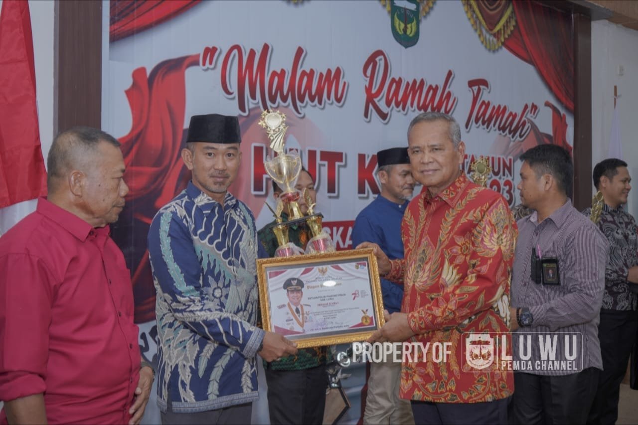 Foto: Bupati Luwu, Dr H Basmin Mattayang Saat Menyerahkan Piala Pada Acara malam ramah tamah di aula rumah jabatan Bupati Luwu, Kelurahan Pammanu Kecamatan Belopa Utara, Kamis, 17 Agustus 2023, malam. (dok.diskominfoluwu)