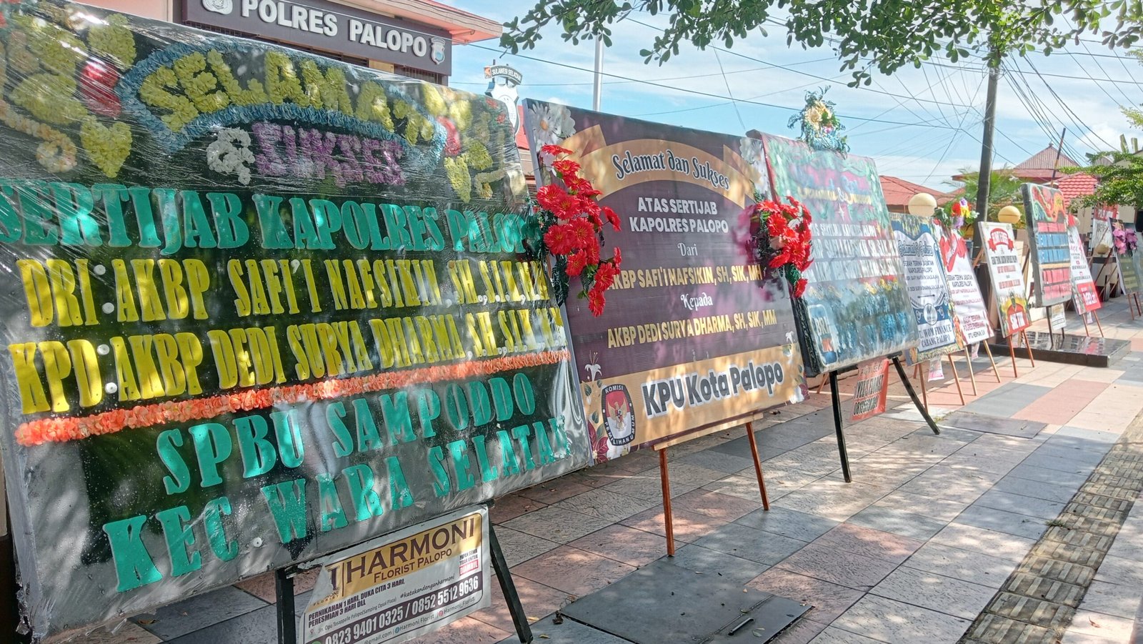 Termasuk di acara pisah sambut Polres Palopo. Karangan bunga datang dari Komisi Pemilihan Umum (KPU) Palopo hingga perusahaan SPBU.