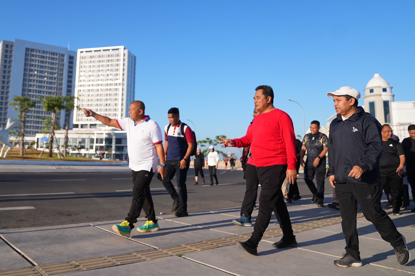 Kini, Bahtiar yang menjabat Pj Gubernur Sulsel, memboyong anak buahnya untuk pertama kalinya jalan pagi di kawasan CPI Tanjung Bunga.