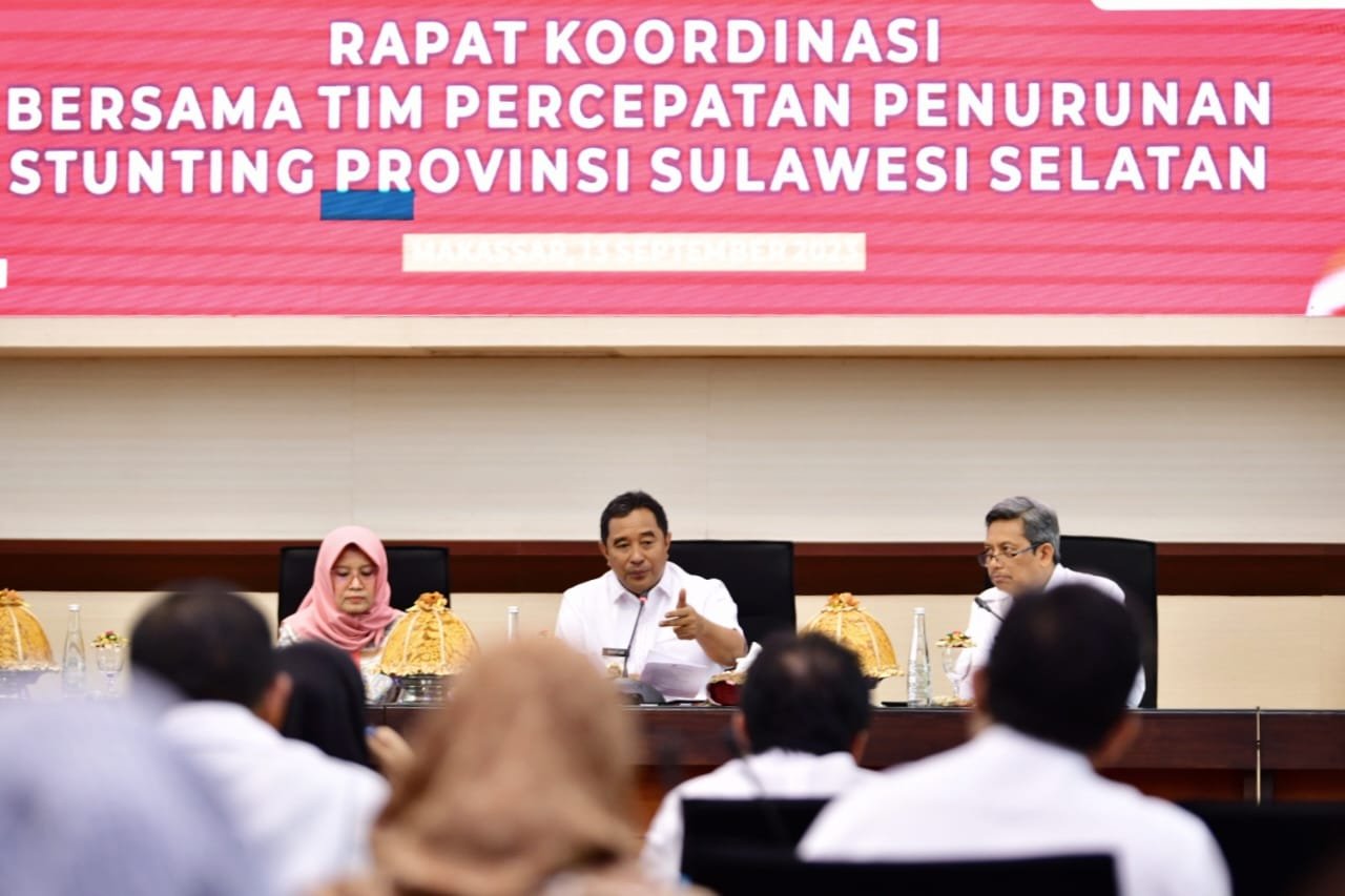 MAKASSAR, TEKAPE.co – Penjabat Gubernur Sulsel, Bahtiar Baharuddin, membuka Rapat Koordinasi (Rakor) bersama Tim Percepatan Penurunan Stunting (TPS) Sulsel, di Ruang Rapat Pimpinan (Rapim) Kantor Gubernur, Rabu, 13 September 2023.