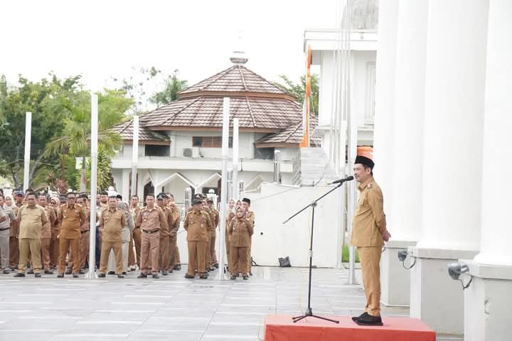 Penjabat (Pj) Wali Kota Palopo, Drs. H. Firmanza DP, memimpin apel gabungan pertama sekaligus kegiatan halal bihalal bersama jajaran Pemerintah Kota Palopo, Selasa (8/4/2025). (ist)