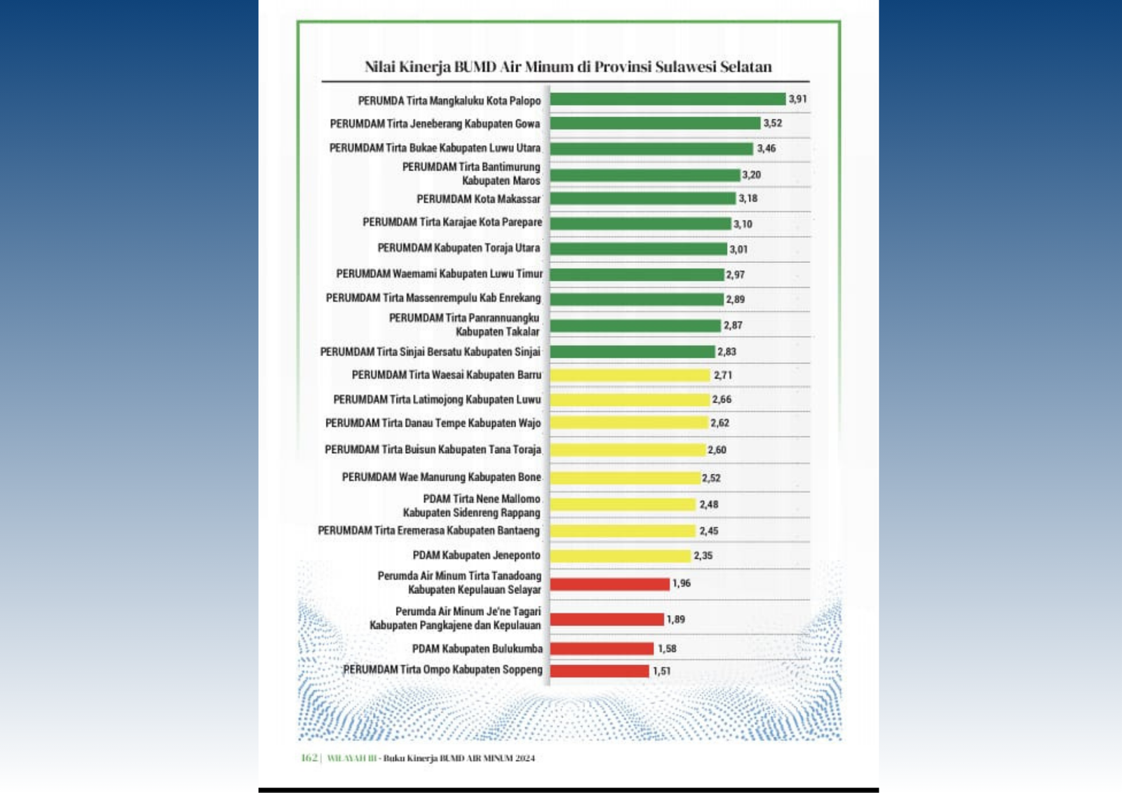 Laporan ini merupakan hasil evaluasi dari Badan Pengawasan Keuangan dan Pembangunan (BPKP) terhadap 23 PDAM di Sulawesi Selatan, berdasarkan empat kategori penilaian utama: Keuangan, Pelayanan, Operasi, dan Sumber Daya Manusia (SDM).
