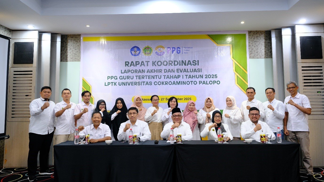 MAKASSAR, TEKAPE.co – Lembaga Pendidikan Tenaga Kependidikan (LPTK) Universitas Cokroaminoto Palopo (UNCP) menggelar Rapat Koordinasi Laporan Akhir dan Evaluasi Program Pendidikan Profesi Guru (PPG) Guru Tertentu Tahap I Tahun 2025.